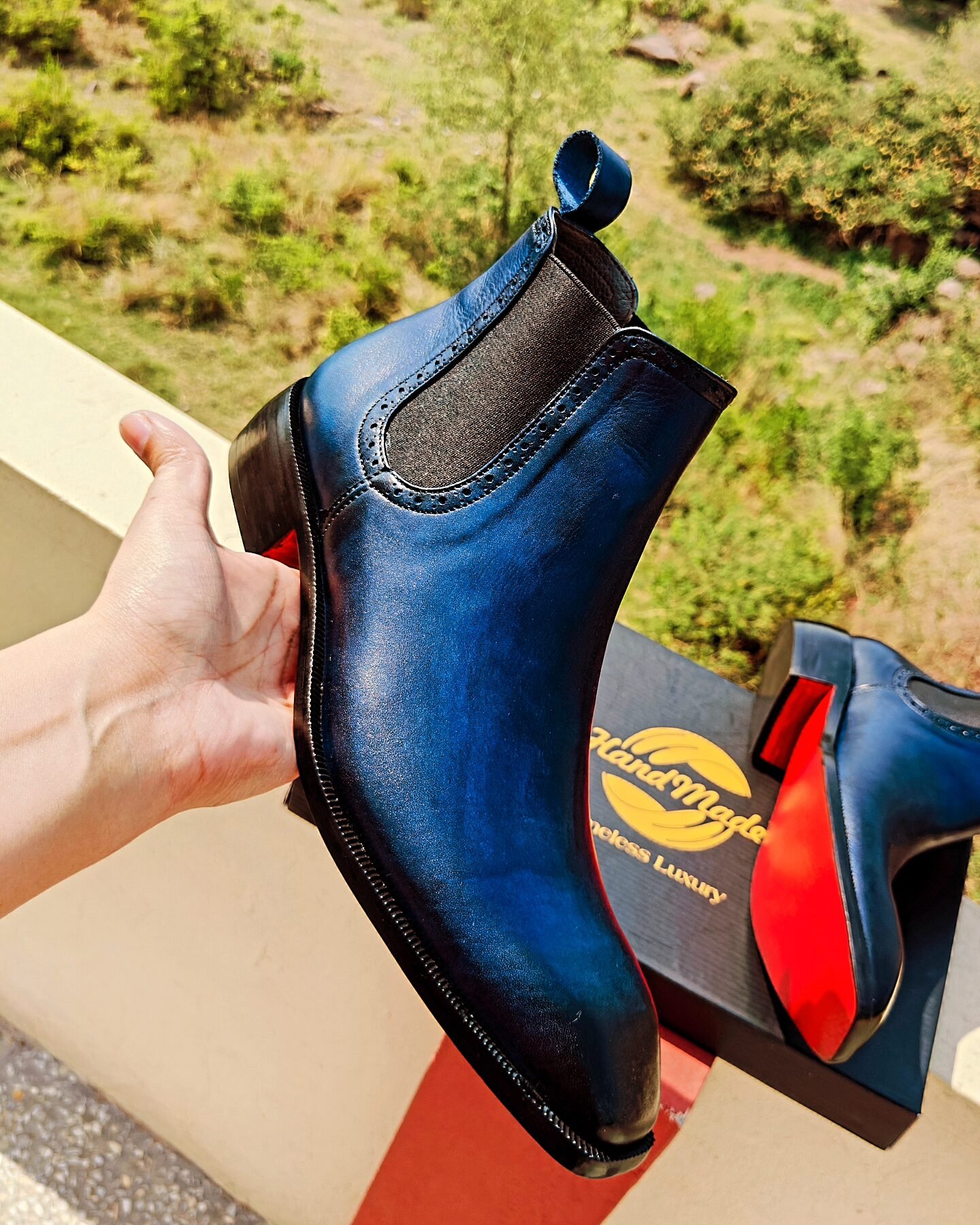 Step into bold sophistication with our handcrafted Blue Chelsea Boots. Featuring a sleek chiseled toe and vibrant blue leather, these boots combine contemporary flair with timeless elegance. The clean slip-on silhouette and comfortable fit make them perfect for upscale casual or formal wear. Built for durability and comfort, these boots are a staple for any modern gentleman seeking distinction in every step.