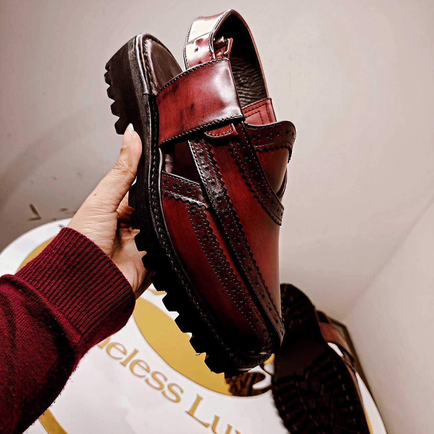 Vibram Sole Chapli | CH-VS-002 | Rich Burgundy | Premium Leather | Imported Vibram Sole | Handcrafted in Pakistan | Note: Each pair is handcrafted on demand with your preferred size and color. If your selected size is not in stock, your custom order will be made and delivered within 14 working days.